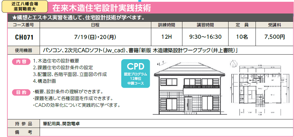 | 設計・製図 | CH071 | 在来木造住宅設計実践技術 | 7/19(日)・20(月祝) | 受付中 | 7,500円 | 構想とエスキス実習を通して、住宅設計技術が学べます。 | Jw_cad |