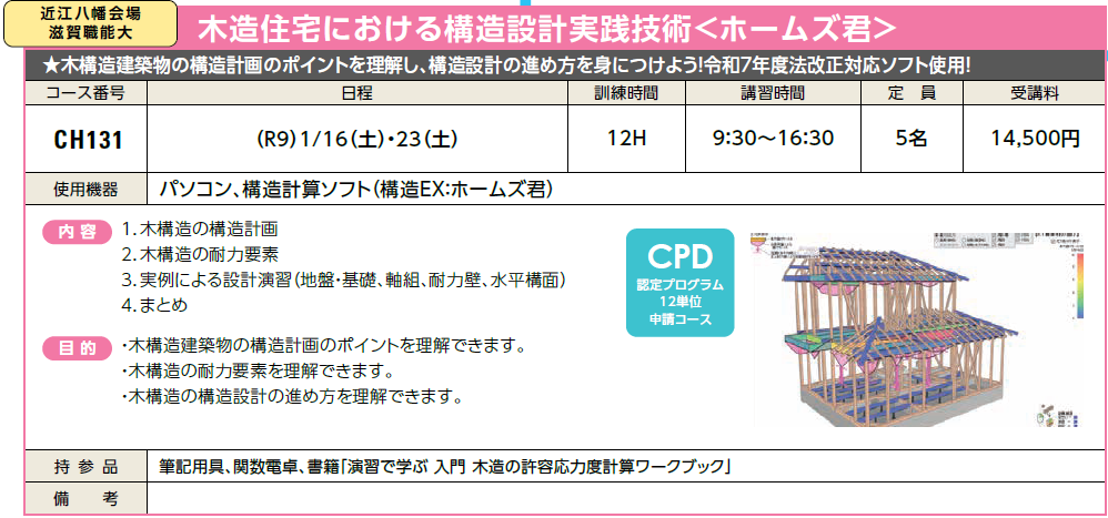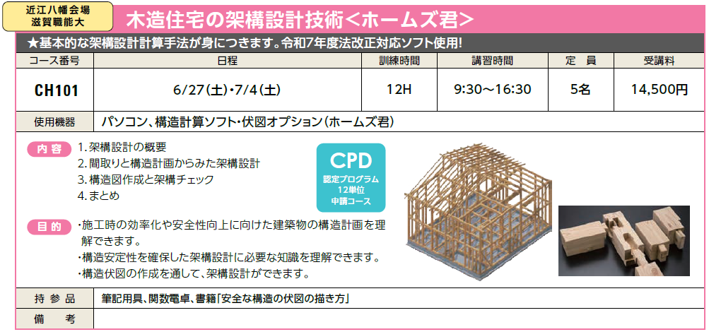 (R9) 1/16(土)・23(土) | 受付中 | 14,500円 | 木構造建築物の構造計画のポイントを理解し、構造設計の進め方を身につけよう! 令和7年度法改正対応ソフト使用! | ホームズ君 | |