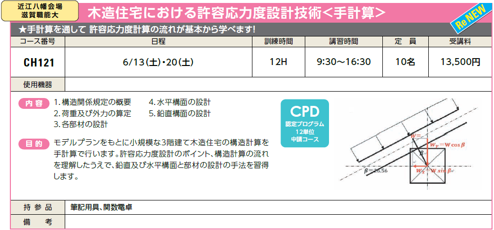6/13(土)・20(土) | 受付中 | 13,500円 | 手計算を通して、許容応力度計算の流れが基本から学べます! | ||
