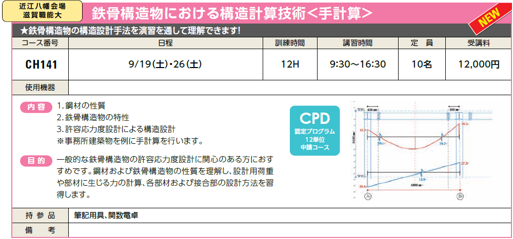 9/19(土)・26(土) | 受付中 | 12,000円 | 鉄骨構造物の構造設計手法を演習を通して理解できます! | ||