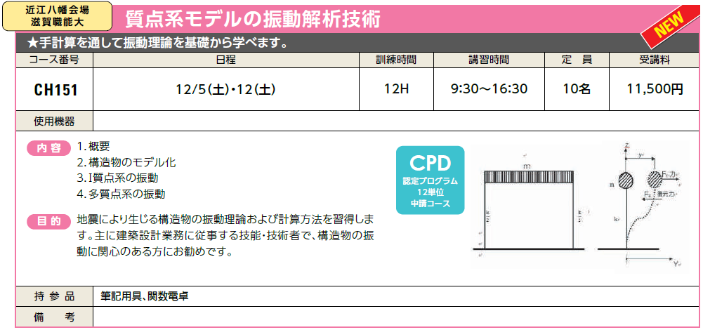 12/5(土)・12(土) | 受付中 | 11,500円 | 手計算を通して振動理論を基礎から学べます。 | ホームズ君 | |