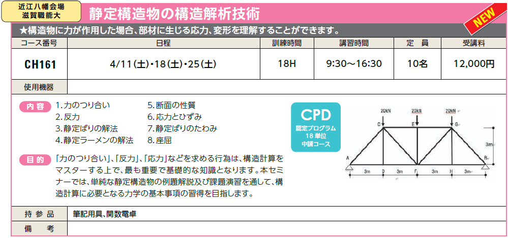 4/11(土)・18(土)・25(土) | 受付中 | 12,000円 | 構造物に力が作用した場合、部材に生じる応力、変形を理解することができます。 | ||