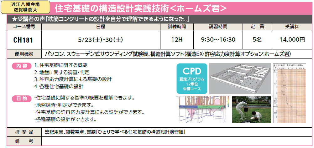 5/23(土)・30(土) | 受付中 | 14,000円 | 受講者の声「鉄筋コンクリートの設計を自分で理解できるようになった」 | スウェーデン式サウンディング試験機、ホームズ君 |