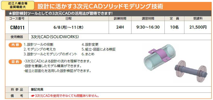 | 機械設計/製図 | CM011 | 設計に活かす3次元CADソリッドモデリング技術 | 6/8(月)~11(木) | 受付中 | 21,500円 | 設計検討ツールとしての3次元CADの活用法が習得できます! | SOLIDWORKS |