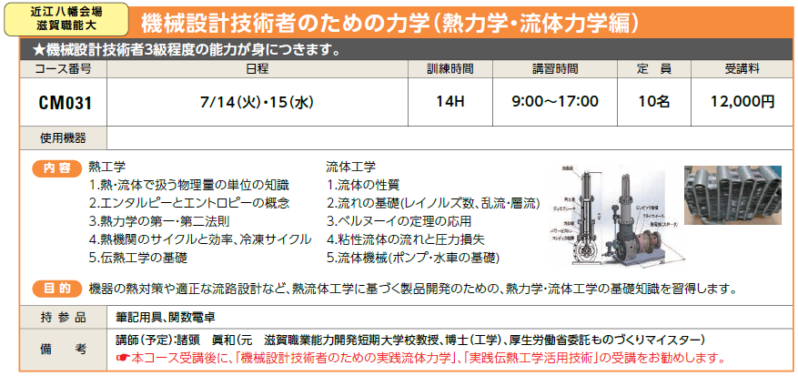 | CM031 | 機械設計技術者のための力学(熱力学・流体力学編) | 7/14(火)・15(水) | 受付中 | 12,000円 | 機械設計技術者3級程度の能力が身につきます。 | ||