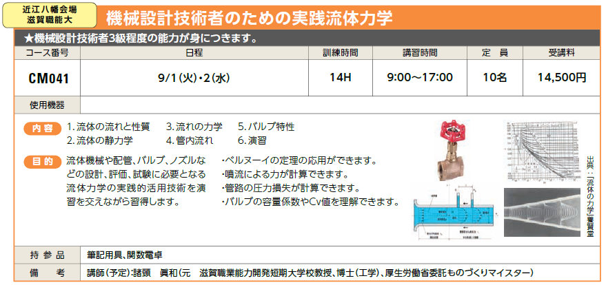 | CM041 | 機械設計技術者のための実践流体力学 | 9/1(火)・2(水) | 受付中 | 14,500円 | 機械設計技術者3級程度の能力が身につきます。 | ||
