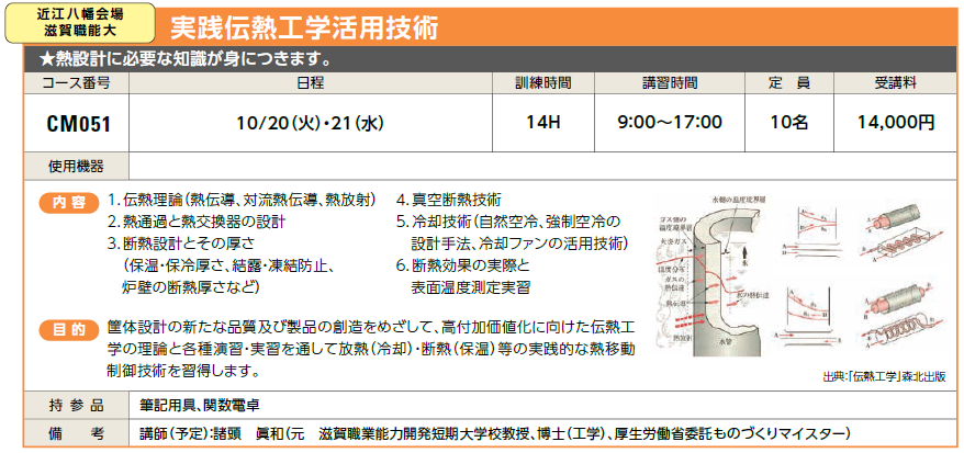 | CM051 | 実践伝熱工学活用技術 | 10/20(火)・21(水) | 受付中 | 14,000円 | 熱設計に必要な知識が身につきます。 | 放射温度計、マルチデータロガー | |