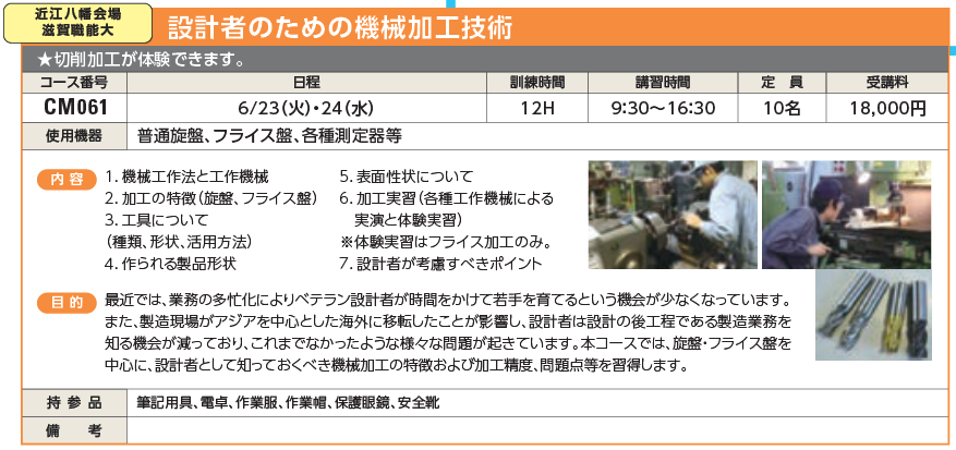 | CM061 | 設計者のための機械加工技術 | 6/23(火)・24(水) | 受付中 | 18,000円 | 切削加工が体験できます。 | DMG MORI LEO-80A、 ETSUKI 2MF-VBS |