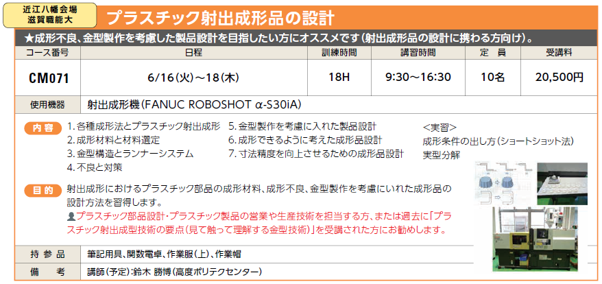 | 成形・金型 | CM071 | プラスチック射出成形品の設計 | 6/16(火)~18(木) | 受付中 | 20,500円 | 成形不良、金型製作を考慮した製品設計を目指したい方にオススメです(射出成形品の設計に携わる方向け)。 | FANUC ROBOSHOT α-S30iA |