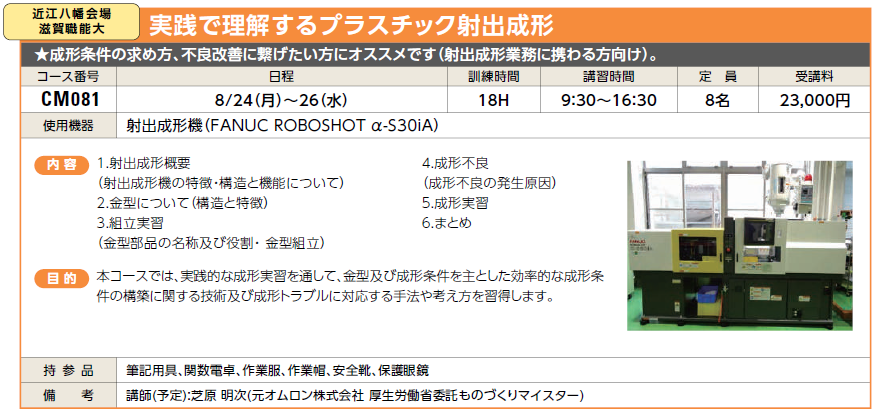 | CM081 | 実践で理解するプラスチック射出成形 | 8/24(月)~26(水) | 受付中 | 23,000円 | 成形条件の求め方、不良改善に繋げたい方にオススメです(射出成形業務に携わる方向け)。 | FANUC ROBOSHOT α-S30iA | |