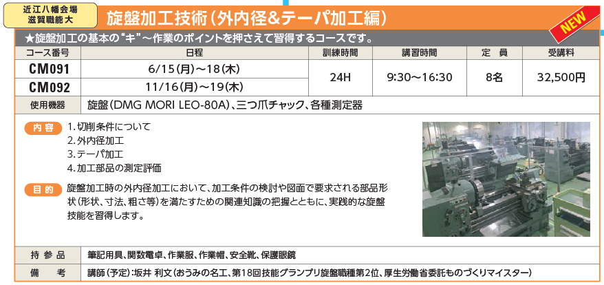 | CM101 | 旋盤作業における熟練技術の継承 | 8/4(火)~6(木) | 受付中 | 24,500円 | 様々な旋盤加工技術の伝承方法を習得できます。 | DMG MORI LEO-80A | |