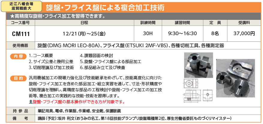| CM111 | 旋盤・フライス盤による複合加工技術 | 12/21(月)~25(金) | 受付中 | 37,000円 | 高精度な旋削・フライス加工を習得できます。 | DMG MORI LEO-80A、 ETSUKI 2MF-VBS |