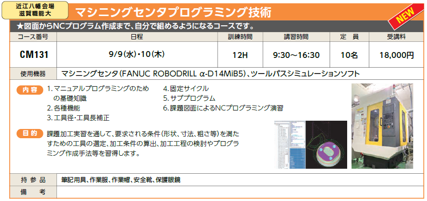 9/9(水)・10(木) | 受付中 | 18,000円 | 図面からNCプログラム作成まで、自分で組めるようになるコースです。 | FANUC ROBODRILL α-D14MiB5 | |