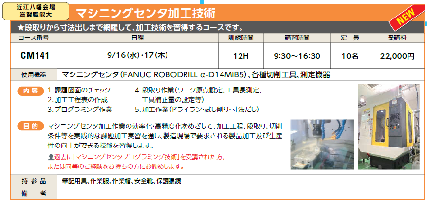 9/16(水)・17(木) | 受付中 | 22,000円 | 段取りから寸法出しまで網羅して、加工技術を習得するコースです。 | FANUC ROBODRILL α-D14MiB5 | |