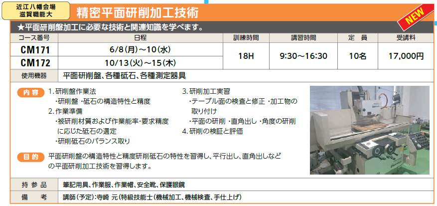 6/8(月)~10(水) | 受付中 | 17,000円 | 平面研削盤加工に必要な技術と関連知識を学べます。 | オカモト PSG63DX | |