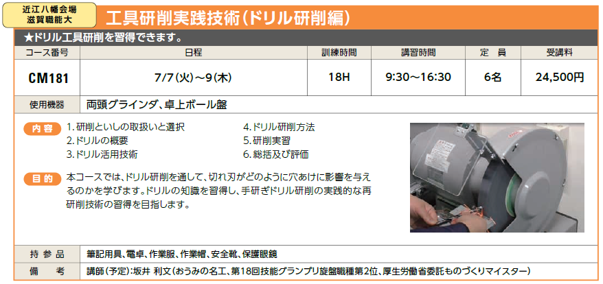 | CM181 | 工具研削実践技術(ドリル研削編) | 7/7(火)~9(木) | 受付中 | 24,500円 | ドリル工具研削を習得できます。 | 両頭グラインダ、卓上ボール盤 | |