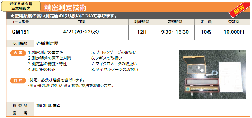 4/21(火)・22(水) | 受付中 | 10,000円 | 使用頻度の高い測定器の取り扱いについて学びます。 | |