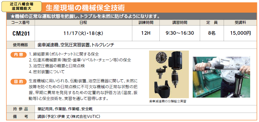 CM201 | 生産現場の機械保全技術 | 11/17(火)・18(水) | 受付中 | 15,000円 | 機械の正常な運転状態を把握し、トラブルを未然に防げるようになります。 | 歯車減速機、空気圧実習装置 |