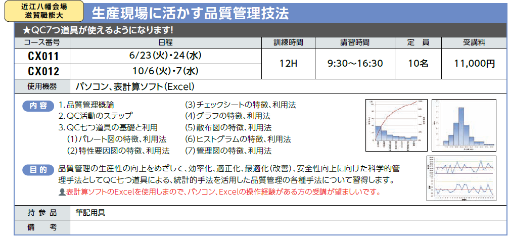 | 保全・管理 | CX011 | 生産現場に活かす品質管理技法 | 6/23(火)・24(水) | 受付中 | 11,000円 | QC7つ道具が使えるようになります! | MS-Excel |