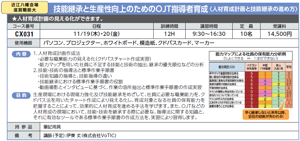 | 教育 | CX031 | 技能継承と生産性向上のためのOJT指導者育成 <人材育成計画と技能継承の進め方> |