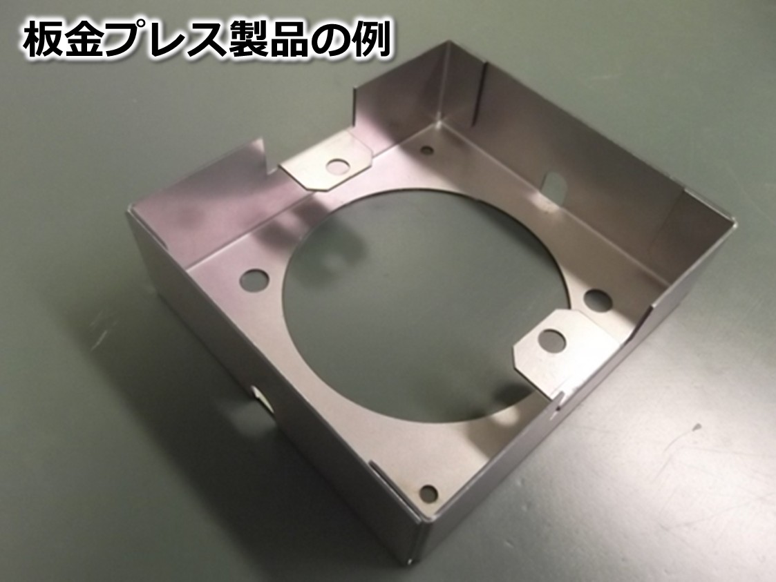 滋賀県の場合には、製缶と並んで板金の企業も多いのですが、その違いは材料の板厚です。板金とは紙工作の材料が金属に変わったようなもので、一般に1.6mmより薄い金属板をプレスで曲げ加工して製品にしていきます。具体的には、一枚の紙を折ってサイコロを作るとき、紙を不均等な十字型に切ってから折って作るように、『折り曲げると完成形になる一枚板の形状』を想像して(展開作業)、その形で切断し、プレスで曲げて成型し、最後に部品同士をスポット溶接して接合して製品にしていきます。