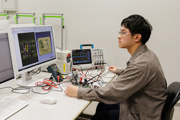 電気自動車や太陽光発電、工場の生産ラインの自動化など、社会を支える電気技術を幅広く学びます。電子回路(パワーエレクトロニクス)の知識や、太陽光パネルから電気を変換する技術を習得します。システムの開発・運用ができるエンジニアを目指すほか、生産現場でリーダーシップを発揮できる基本的な技術を持つ人材を育成します。