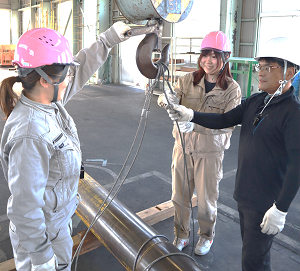 - ステンレス製品やプラント配管を溶接できるTIG 溶接や、屋外作業に向いている被覆アーク溶接の技能を習得します。また、天井クレーンやトラックに設置されているクレーンで、荷物をフックに吊るして運搬する技能を習得します。
